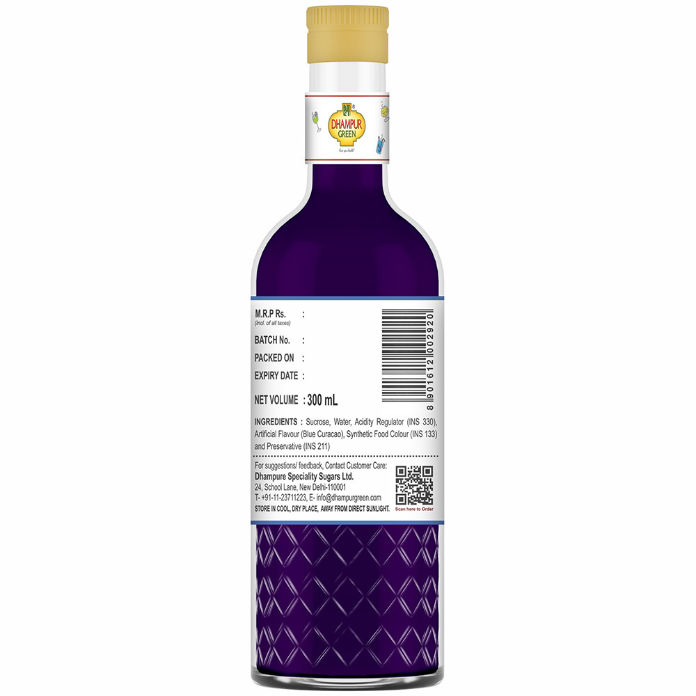 Tempting tropical Blue Curacao, inspired by the namesake liqueur, conjures the colour of tropical blue skies on the island of curacao. Ravishing to look at, this syrup makes drinks tempting you to dive into the tropical blue waters or lounge blissfully on a hammock on your Caribbean resort! The sweet-bitter, and tangy flavor of Dhampur Green Blue Curacao Syrup adds zest to any celebration or beverage. Its deep blue color makes it perfect with fruit beverages, mixers, soda or water. Renovate your ordinary drink with this mildly orange flavor and vivid blue colour drink! Though it is alcohol-free, you and your drink will become life of the party!