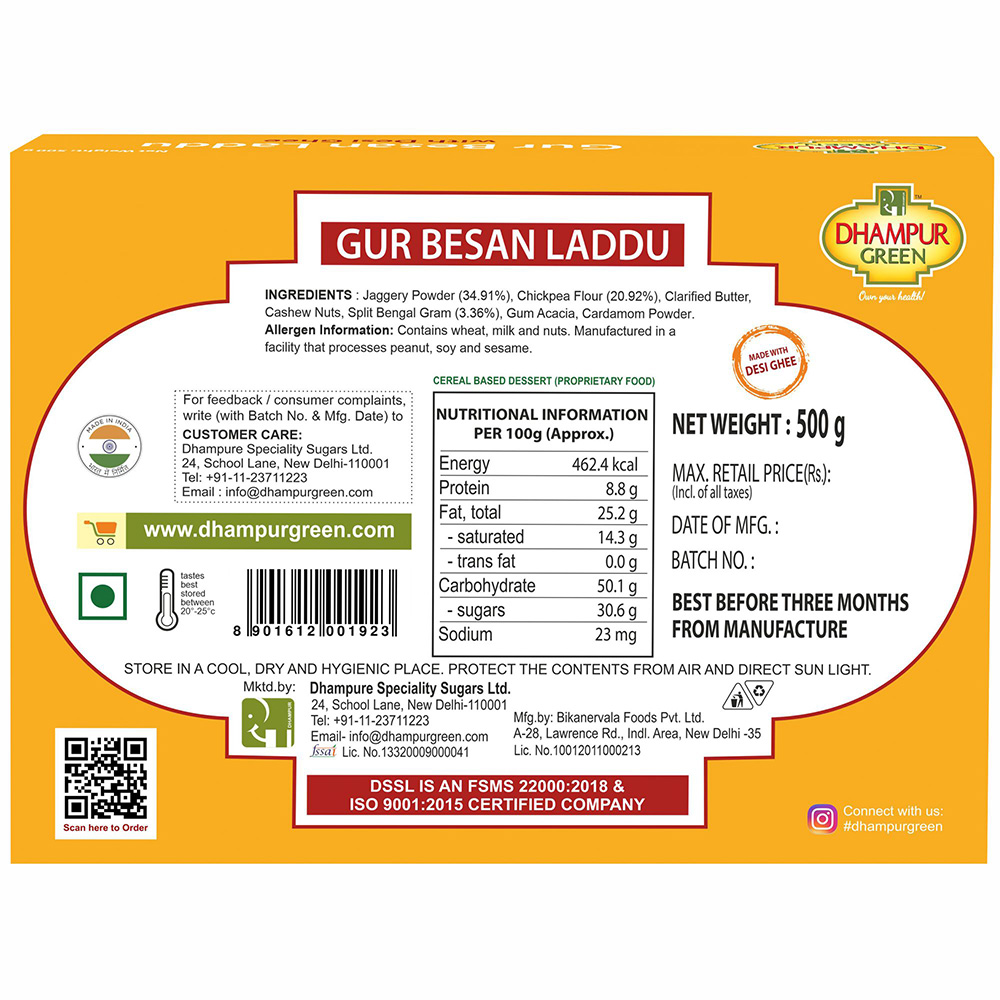Dhampur gur besan laddu is the premium and exclusive range from the House of Dhampur. Our indulgent and aspirational range made from the finest ingredients such as gur, besan and some dry fruits, we cater to an audience of evolved and varied tastes while remaining true to Dhampur core values of trust and quality