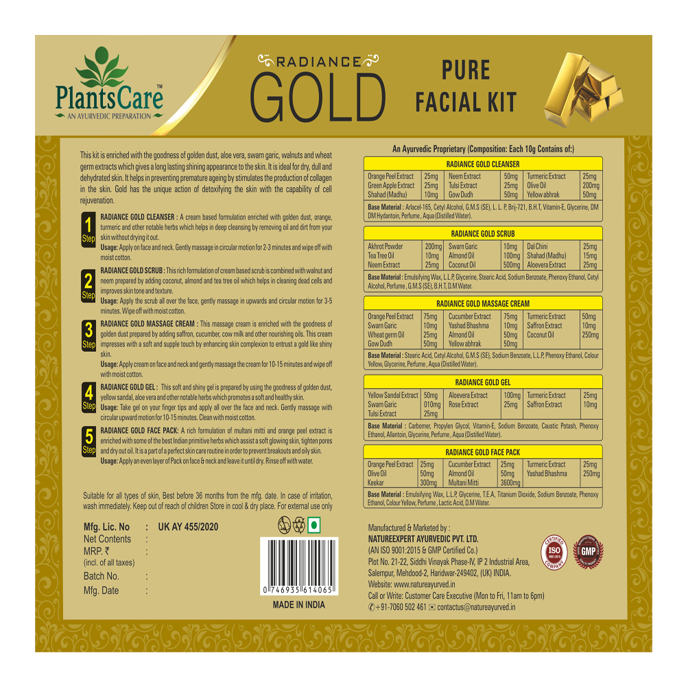 RADIANCE GOLD MASSAGE CREAM : Orange Peel Extract 75mg, Cucumber Extract 75mg, Turmeric Extract 50mg, Swarn Garic 10mg, Yashad Bhashma 10mg, Saffron Extract 10mg, Wheat germ Oil 25mg, Almond Oil 50mg, Coconut Oil 250mg, Gow Dudh 50mg, Yellow abhrak 50mg.