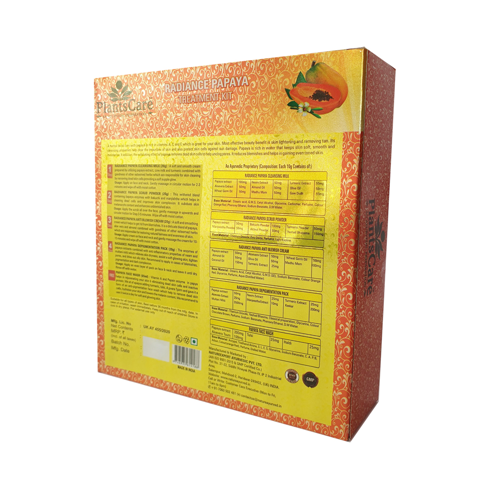 RADIANCE PAPAYA SCRUB POWDER : Papaya extract 50mg, Bakuchi Powder 100mg, Turmeric Powder 50mg, Manjeestha Powder 50mg, Akhrot Powder 50mg.